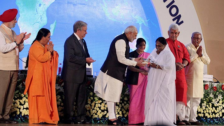Amma ha ricevuto un premio per il più grande contributo alla Swacch Bharat Khosh (Clean India Campaign) dal primo ministro Shri Narendra Modi e dal segretario generale delle Nazioni Unite Antonio Guterres.