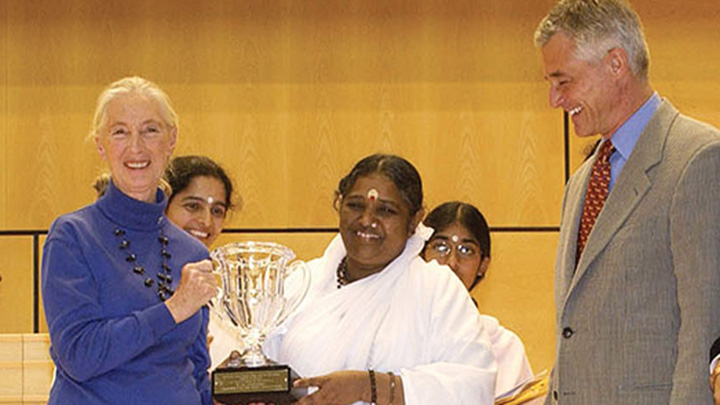 Il Messaggero delle Nazioni Unite per la pace, dott. Jane Goodall e l’Alto Commissario delle Nazioni Unite per i Diritti Umani, Sergio Vieira de Mello, hanno consegnato ad Amma il Gandhi-King Award for Nonviolence.