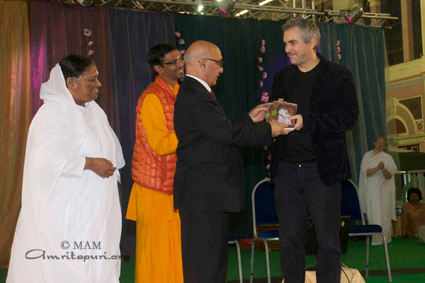 A dare il benvenuto ad Amma sul palco c’era anche il famoso regista, sceneggiatore e produttore, Alfonso Cuarón, meglio conosciuto per film come ‘I figli degli uomini’, ‘Y tu mamá también’ e Harry Potter e il prigioniero di Azkaban’. Il sig. Cuarón ha presentato ufficialmente nel Regno Unito il nuovo progetto di Embracing the World, InDeed.