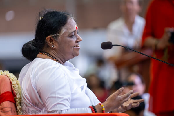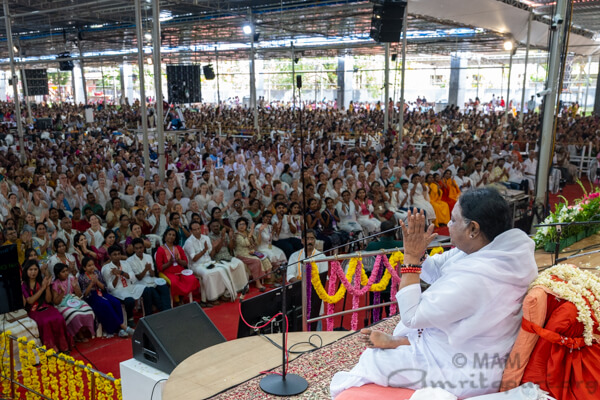 Dopo la cerimonia del padapuja, Amma si è rivolta all’assemblea. Ha detto: “Da 65 anni Amma ascolta i dolori dei suoi figli, le loro piccole gioie, le loro lamentele e le loro afflizioni. Amma conosce intimamente la profondità dei loro tormenti e il dolore che si cela dietro le loro lacrime. Anche se non riusciamo ad abbandonare completamente le nostre vecchie cattive abitudini, dobbiamo almeno provarci. Nuove abitudini che aiutano la nostra crescita interiore e apportano benefici alla società dovrebbero nascere dentro di noi. Questo è il vero compleanno. In questo modo, continueranno a verificarsi innumerevoli nuove nascite di bontà. Quando tali alberi di virtù fioriranno dentro di noi, i colori e il profumo dei loro fiori si diffonderanno ovunque. Porteranno gioia infinita a noi e agli altri. Questa è la vera celebrazione del compleanno. Amma sa che cambiare non è facile. Ma l’oscurità si sta diffondendo ovunque e l’ansia per il futuro sta aumentando. In una situazione del genere, ogni individuo deve diventare un piccolo albero di bontà. Altrimenti, il mondo non cambierà”.