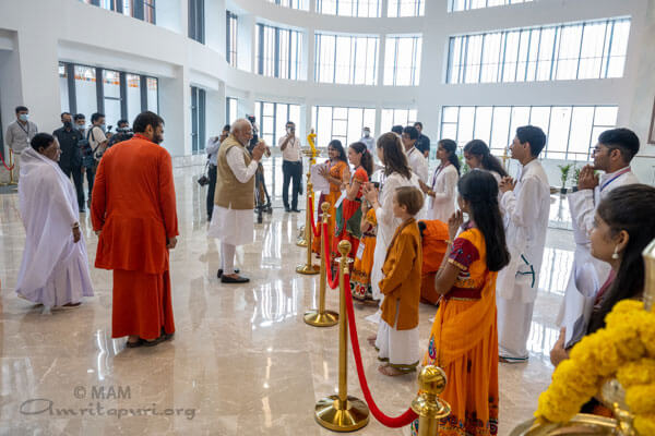 All’arrivo, nell’atrio dell’ospedale, mentre i ragazzi e i bambini che vivono nell’ashram di Amritapuri cantavano mantra vedici, Amma e Shri Narendra Modi insieme hanno acceso la lampada cerimoniale. A seguire il primo ministro ha avuto un incontro privato con Amma.