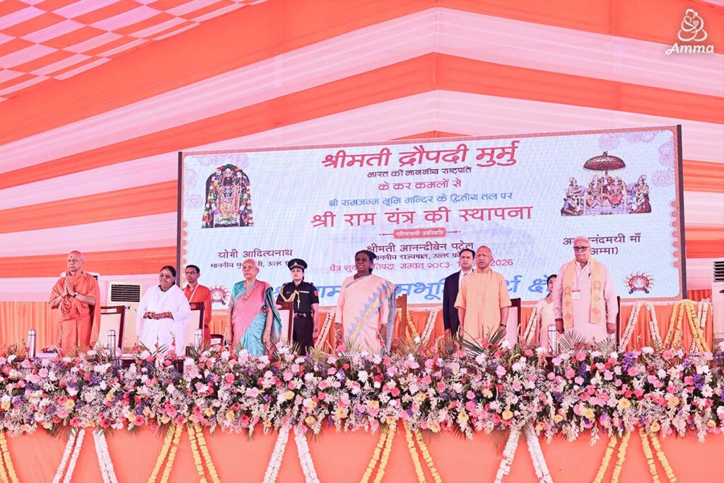 Desiderando la presenza di un Mahatma in un’occasione così sacra, lo Shri Ram Janmabhoomi Teerth Kshetra Trust ha invitato Amma alla cerimonia di installazione. Dopo la pratishta del Rama Yantra, Amma e la Presidente Murmu hanno offerto il loro tributo.