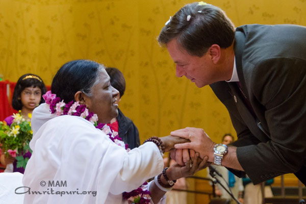 Commentando successivamente questo incontro, il reverendo ha detto: “Avremmo voluto rimanere per l’intera serata ma, poco dopo aver ricevuto l’abbraccio, abbiamo dovuto salutare Amma e siamo dovuti ripartire per la veglia* in onore delle vittime della sparatoria alla Cattedrale di St. Mark’s. Abbiamo comunque avuto la possibilità di aggiornarci sull’enorme lavoro che questa donna ha fatto e sta facendo nella sua terra natia, l’India, e ancor di più in tutto il mondo. E’ un onore e una benedizione essere alla sua presenza.”