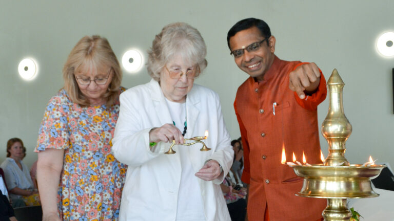 Swami Shubamritananda Puri avvia l’incontro con la tradizionale accensione della lampada che anche simboleggia il messaggio dei Civil 20 dell’India — Tu sei luce.