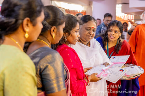 Durante il festival, Amma ha distribuito sari e aiuti finanziari ai membri del gruppo di auto-aiuto AmritaSREE. Questi aiuti sosterranno il loro cammino verso l’autosufficienza. Amma ha guidato i volontari nella meditazione Manasa Puja e Ma-Om dando personalmente istruzioni in Tamil. A seguire l’esecuzione dei bhajan che hanno elevato gli animi e infine preghiere di pace.