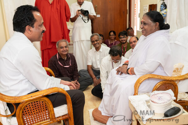 In una significativa confluenza di scienza e spiritualità, Sreedhara Panicker Somanath, il presidente dell’Organizzazione indiana per la ricerca spaziale (ISRO), ha incontrato Amma ad Amritapuri. L’incontro, durato quasi un’ora, ha riguardato un’ampia gamma di discussioni scientifiche e culturali.