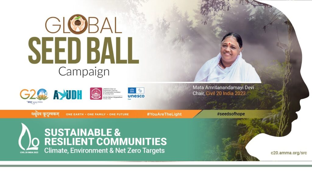 Il gruppo di lavoro Sustainable and Resilient Communities (SRC) del Civil 20 ha lanciato la Global Seedball Campaign: Seeds of Hope (Semi di speranza), un’iniziativa che ha l’obiettivo di disperdere un milione di palline di semi in ecosistemi fragili in tutto il mondo. Sotto la guida e la visione di Amma, in qualità di presidente del C20 per la presidenza indiana del G20, l’SRC è profondamente onorato di lavorare per guidare la produzione e la distribuzione delle palle di semi per l’anno 2023.