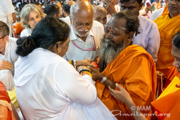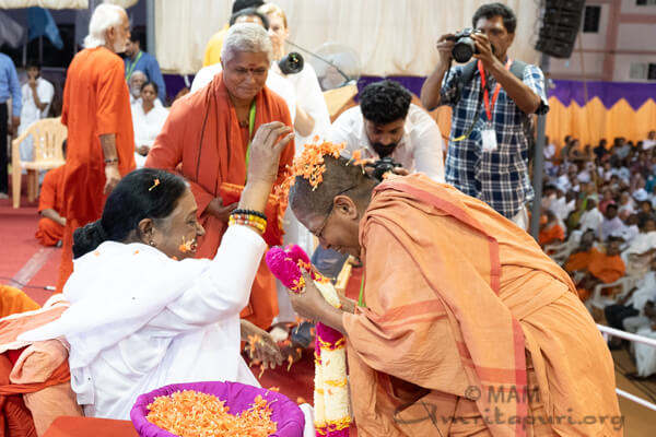 Nel suo satsang, Amma ha ricordato a tutti la natura fugace della vita e l’importanza di vivere in modo significativo. “La vita è un breve intervallo tra la nascita e la morte. Diventa veramente rilevante e significativa solo quando le nostre azioni sono radicate nel bene. Con “buone azioni”, Amma si riferisce all’adempimento delle nostre responsabilità verso la natura, i nostri simili e tutte le creature viventi.