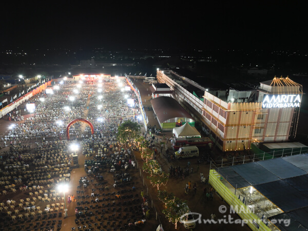 Il programma ha previsto anche varie iniziative umanitarie. Migliaia di donne di Amrita SREE Self-Help Groups hanno ricevuto sari come parte degli sforzi dell’Ashram di renderle forti e indipendenti. Al raduno sono stati serviti pasti gratuiti, facendo in modo che nessuno ne rimanesse senza. La notte ha anche visto vivaci esibizioni culturali dei bambini di Amrita Vidyalayam, aggiungendo uno spirito festoso all’evento.