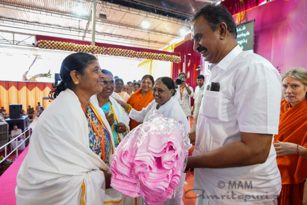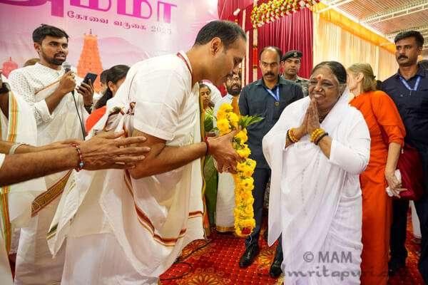 Amma è stata accolta calorosamente al suo arrivo sul palco da molti ospiti illustri, tra cui il giudice della corte distrettuale, parlamentari locali, funzionari governativi e i leader spirituali di diversi Ashram in e intorno a Coimbatore.
