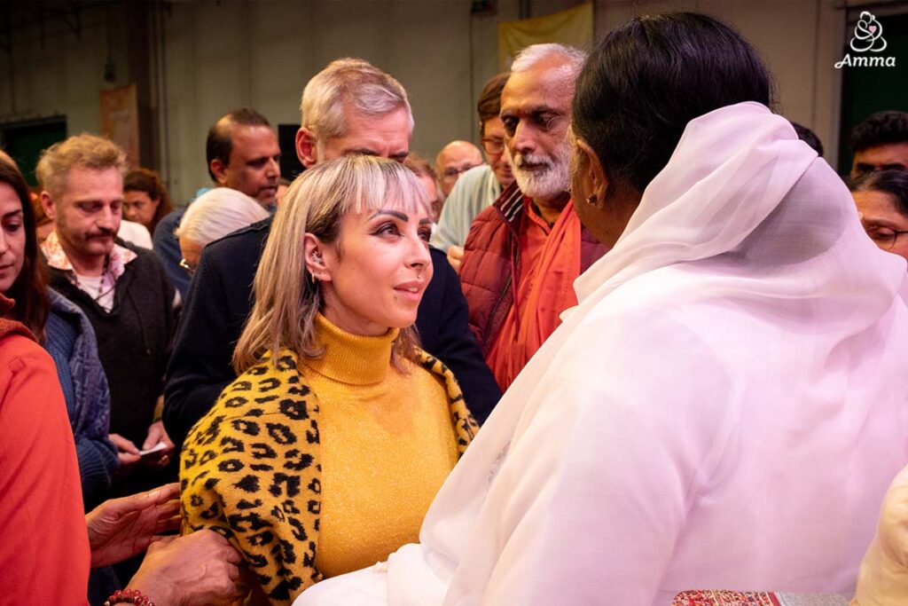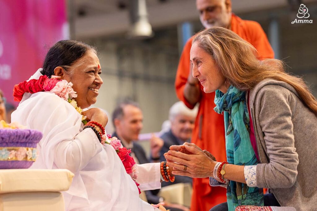 “Non so co sa dire a riguardo di Amma—le sue attività umanitarie parlano da sole. Quando la vedo mi sento profondamente toccata e commossa.” Ha detto.