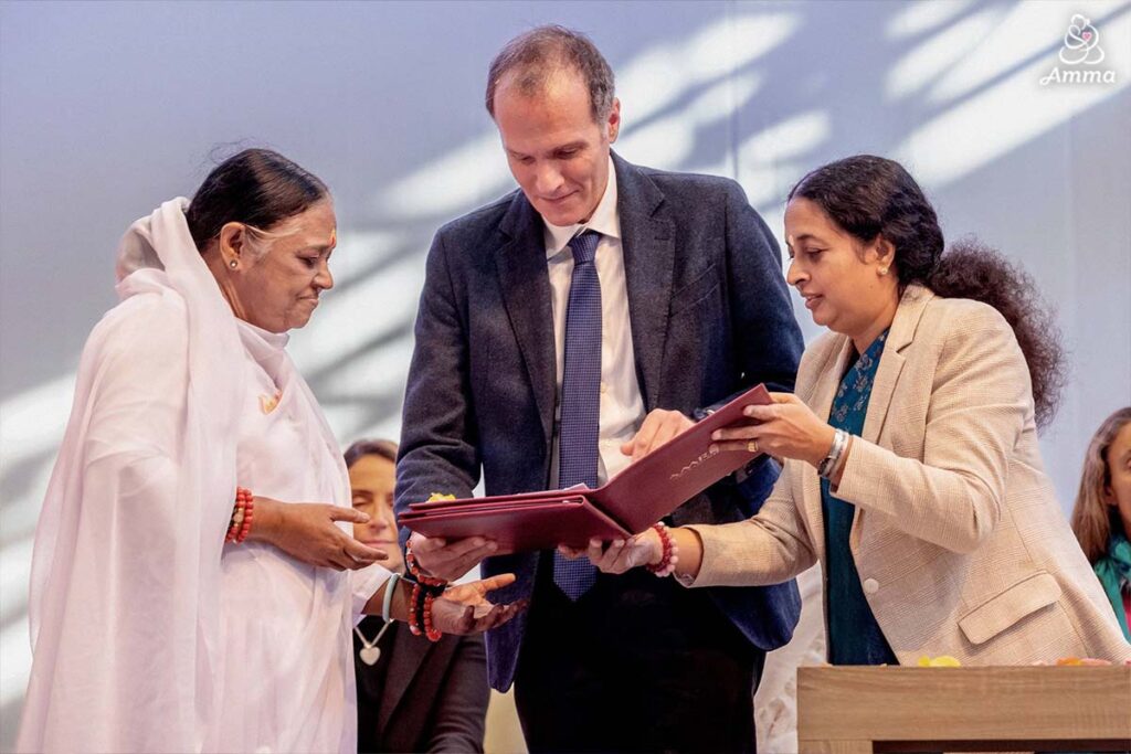 “Grazie per avermi dato la possibilità di questa nuova esperienza. Sono un ricercatore e non conoscevo Amma, ma mi ha favorevolmente stupito. Io vivo nella terra di san Francesco di Assisi, e la missione di Amma mi sembra molto in linea con quella di san Francesco.” Ha detto nel suo discorso.