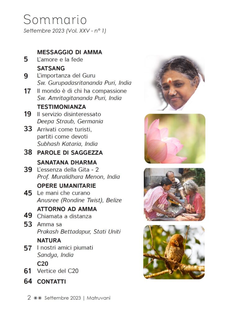 Matruvani è una rivista trimestrale che trasmette il messaggio di amore e di pace di Amma. Contiene discorsi di Amma, relazioni sulle sue numerose iniziative e progetti, preziose testimonianze ed esperienze dei volontari e la descrizione delle sue molteplici opere umanitarie.