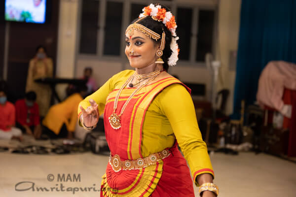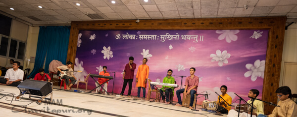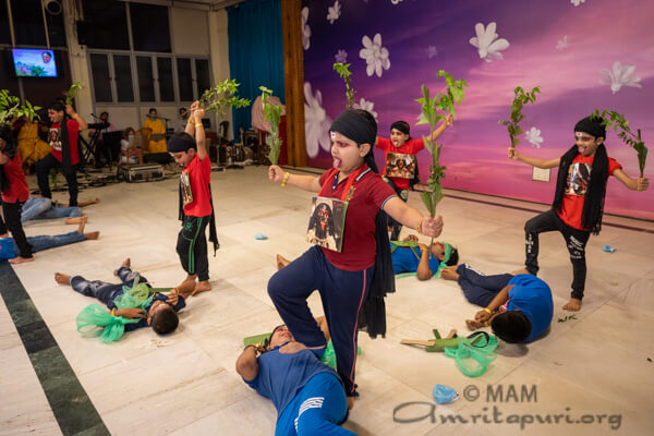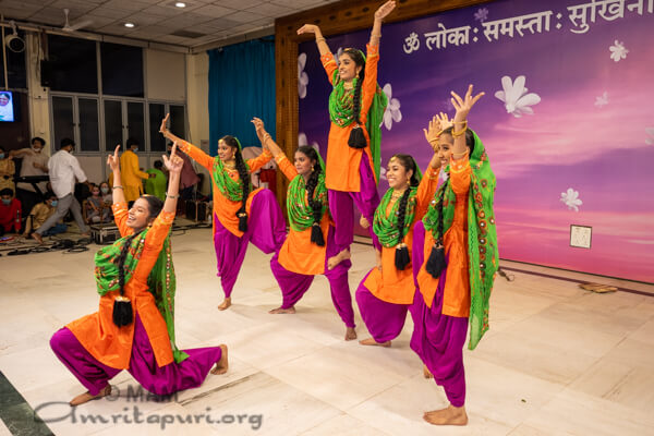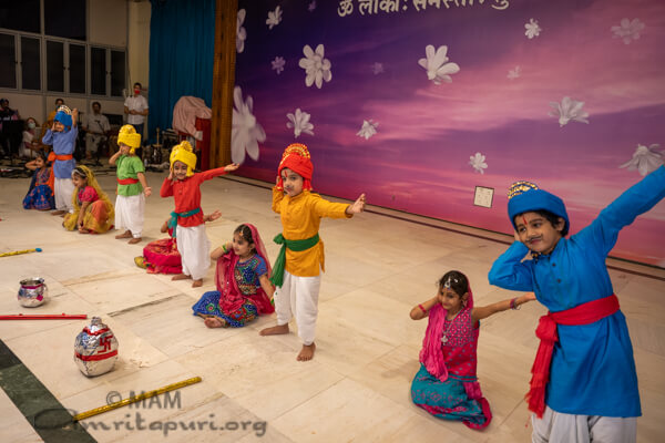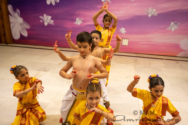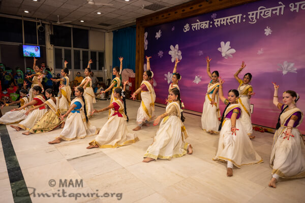 I festeggiamenti per il Capodanno sono iniziati con un’ampia serie di spettacoli tenuti dai bambini dell’ashram, tra questi: le danze Thiruvathira, Bhangra e Bharata natyam, uno spettacolo di pupazzetti e un musical. Al termine delle performance, Amma ha tenuto il discorso di Capodanno. E allo scoccare della mezzanotte ha condotto tutti nel canto del mantra Loka Samastha Sukhino Bhavanthu, la preghiera per la pace nel mondo. Terminata la preghiera Amma ha invitato tutti a iniziare gioiosamente l’anno cantando “May the Light of Unity” e “Sibji Bole”, un bhajan bengalese, e infine ha distribuito del succo come prasad a tutti presenti.