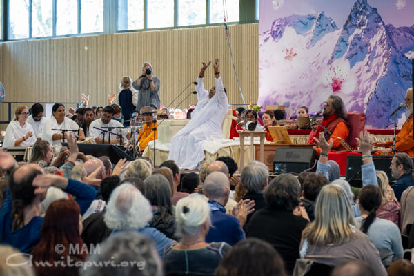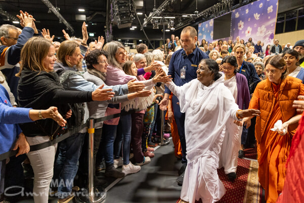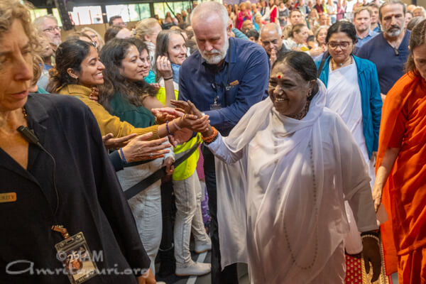 Rivolgendosi alla folla, Zoë Pastelle ha detto: “Amma, nel tuo discorso al Parlamento delle Religioni del Mondo a Barcellona, hai detto: ‘L’amore è la nostra vera essenza. L’amore non conosce confini come la religione, il colore della pelle, la nazionalità o la casta. Siamo tutti perle infilate sullo stesso filo dell’amore. Riconoscere questa unità e portare nel mondo l’amore che è la nostra vera natura: questo è lo scopo della vita umana’. Queste parole sono più attuali che mai nel nostro mondo, dove il divario tra ricchi e poveri si allarga ogni giorno di più, dove c’è tanta violenza e l’armonia nella natura è compromessa. Spero che tutti noi risvegliamo questo amore onnicomprensivo. Affinché il nostro mondo sia pacifico, il nostro bellissimo pianeta sia protetto e anche i nostri figli possano sperimentare questa bellezza”. La sala ha risposto con un fragoroso applauso.