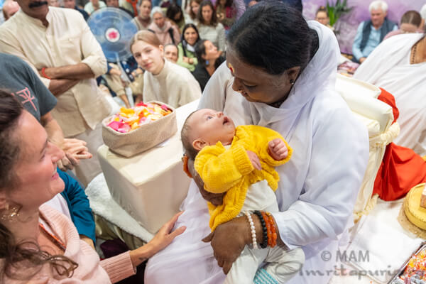 Ogni giorno, in molti hanno ricevuto il mantra da Amma, quasi 900 in totale. Un momento commovente è stato quando una famiglia ha ricevuto il mantra insieme; il bambino più grande aveva 6 anni e il più piccolo meno di due e non parlava ancora, ma Amma gli ha dato il mantra, onorando l’impegno dei genitori nei confronti dei valori spirituali.