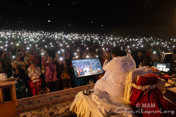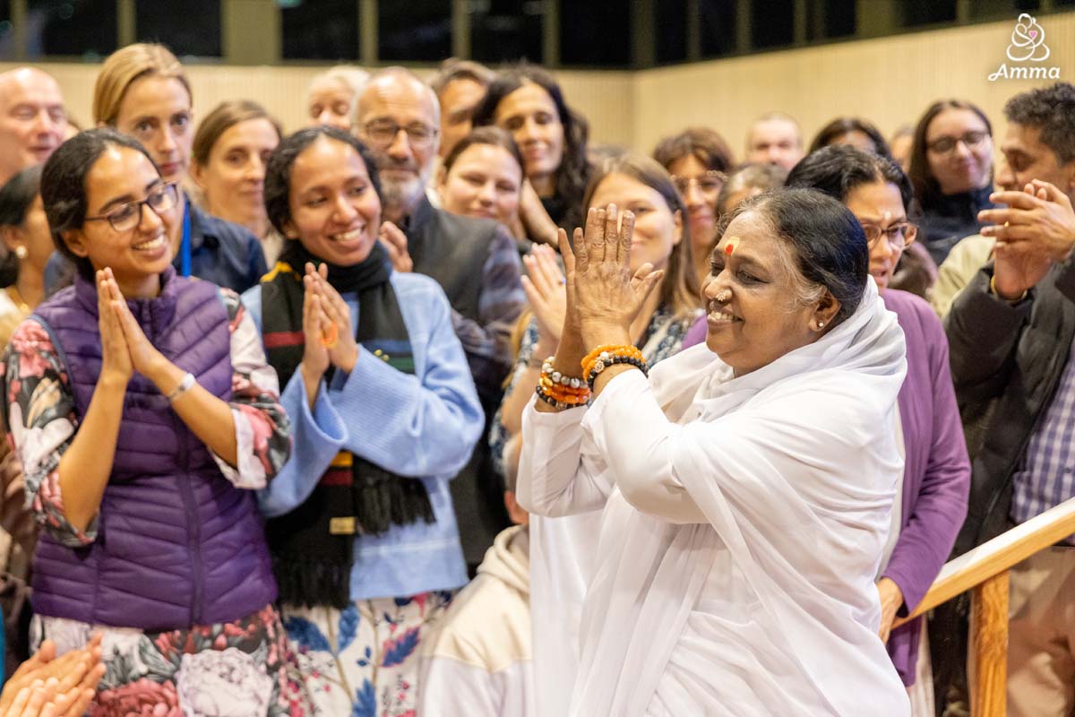 La folla ha riempito la sala principale e anche la sala da pranzo adiacente era piena di pubblico che guardava il grande schermo. Sia i bambini che gli anziani hanno sfidato il freddo, con temperature comprese tra i 4 e i 10 gradi. Il bambino più piccolo aveva 15 giorni. Molti hanno aspettato ore per vedere Amma, versando lacrime di gioia per il ricongiungimento, di amore, speranza e convinzione.